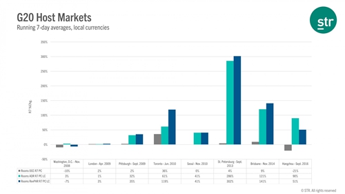 STR研究發現,主辦G20峰會對酒店的平均每日房價(ADR)的影響比入住率更大。
