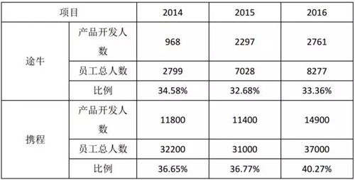 第三,員工人數。我們認為,如果途牛是自營類企業,那么它在產品開發方面的員工人數占比應當相對較高,事實上,就途牛單個企業來看,它負責產品開發類的員工人的確很多,占到了1/3左右,但是與攜程相比,近三年這個數字兩家企業相差不大。這表明,也許途牛實際的模式與攜程并沒有什么區別,至少在產品研發上,它并沒有展示出明顯的優勢。