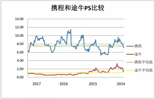 從2014年到2017年市銷率(周數據)可以看出,途牛的該數值在攜程的1/6左右。我們認為,途牛之所以在上市時選擇將收入以全額入賬,很大可能是為了做高收入,從而希望在用P/S與攜程做對標時能夠提高自己的市場估值。然而,這樣的做法并未得到市場認可,上市以來的股價一路下滑。