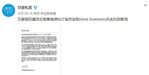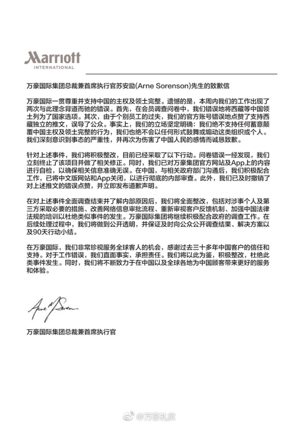 1月12日凌晨,萬豪國際集團微博賬號“萬豪禮賞”發布該集團總裁兼CEO蘇安勵的致歉信。致歉信中稱,“由于個別員工的過失,我們的官方賬號錯誤地點贊了支持‘西藏獨立’的推文,誤導了公眾。”