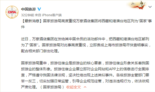 據國家旅游局官方微博11日通報,國家旅游局高度重視萬豪國際集團將西藏和港澳臺地區列為“國家”事件。