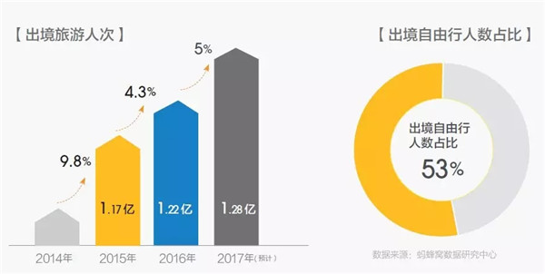 2017年全年中國公民出境游人次將達(dá)到1.28億人次,相當(dāng)于日本總?cè)丝冢?016年增長接近5%。其中,出境自由行人數(shù)占比53%。