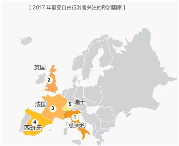 2017年最受自由行游客青睞的歐洲旅游目的地分別是意大利、英國、法國、西班牙和瑞士。其中,由于意大利、法國和瑞士相近,多自由行游客會在規(guī)劃行程時(shí)選擇“法意瑞”游玩路線,在15天左右的時(shí)間里玩轉(zhuǎn)三個(gè)國家。