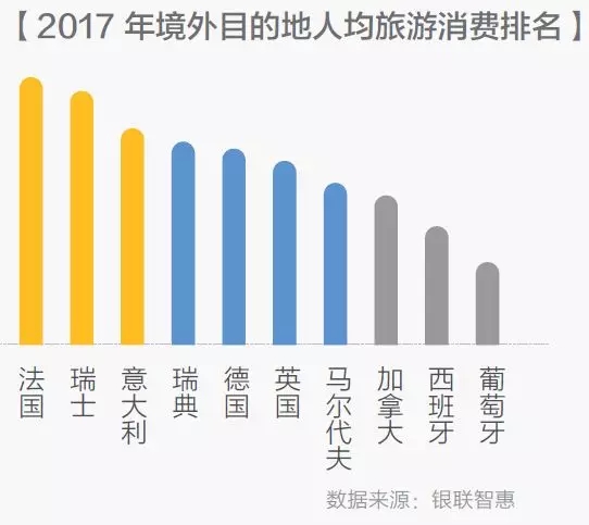 數(shù)據(jù)顯示,法國、瑞士、意大利、瑞典、德國、英國、馬爾代夫、加拿大、西班牙、葡萄牙的人均旅游消費(fèi)最高。歐洲物價(jià)整體偏高是一方面原因,另一方面原因是歐洲游的購物消費(fèi)也遠(yuǎn)高于其他目的地。