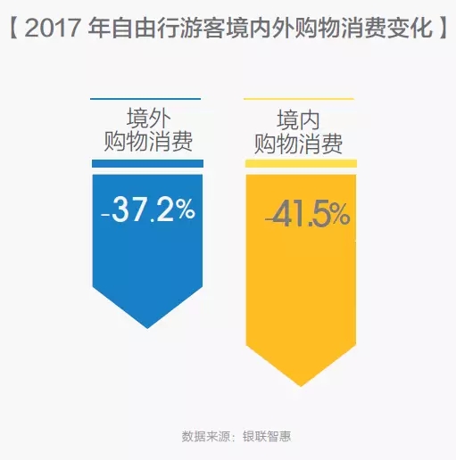 與2016年相比,2017年自由行游客的境內(nèi)購物消費(fèi)下降41.5%,境外購物消費(fèi)下降37.2%。自由行游客選擇將減少的購物消費(fèi)支出投入到體驗(yàn)消費(fèi)上,如美食、文化娛樂等。