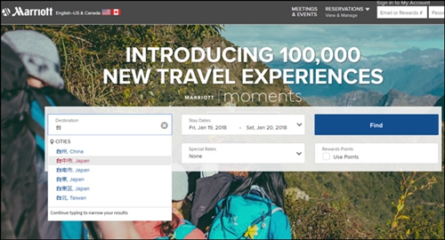 新聞來源:宏輝智通 發布日期:2018-01-20 瀏覽次數:3128在萬豪英文版網站頁面輸入“臺”字,下拉菜單中出現中國臺灣的“臺中市”、“臺南市”和“臺東(縣)”,竟然都被標明所屬于日本。
