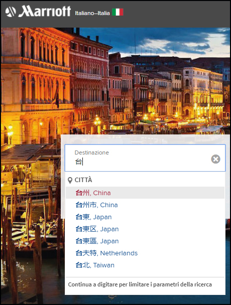 登陸萬豪法文版、意大利文版查詢,沒有出現臺中、臺南,但臺東仍顯示為屬于日本,推薦的是東京的酒店。