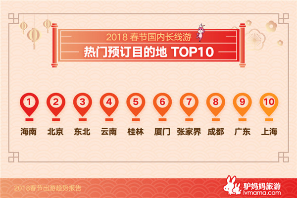 驢媽媽國內(nèi)跟團游負責人吳雪峰表示,每年春節(jié)4-5人的全家出游較多,而今年春節(jié)親朋好友組成的多個家庭一起出游的訂單大幅增長,春節(jié)出游的游客對價格的敏感度不高,更追求產(chǎn)品的品質(zhì)和服務。在國內(nèi)長線游方面,冰雪、溫泉和海島線依然是今年春節(jié)最熱。北方人熱衷到海南曬太陽,南方人則選擇到北方看冰雪。驢媽媽旅游網(wǎng)截至目前的國內(nèi)長線游預訂數(shù)據(jù)顯示,春節(jié)期間,海南、北京、東北、云南、桂林、廈門、張家界、成都、廣東、上海成為國內(nèi)長線游的十大熱門目的地。