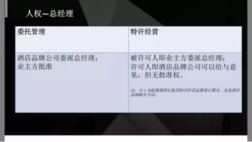 當(dāng)然,在溫德姆酒店集團(tuán)的特許經(jīng)營模式下,總經(jīng)理必須要經(jīng)過我們溫德姆酒店集團(tuán)的培訓(xùn),他必須要拿到資格上崗認(rèn)證才能夠作為溫德姆酒店集團(tuán)旗下品牌的總經(jīng)理入職,總經(jīng)理到位以后,所有酒店的主要部門的負(fù)責(zé)人,比如說財(cái)務(wù)總監(jiān)、人力資源總監(jiān)、市場(chǎng)銷售總監(jiān)等,均是由總經(jīng)理到達(dá)現(xiàn)場(chǎng)以后自行組建團(tuán)隊(duì)。所以實(shí)際上在委托管理和特許經(jīng)營的這個(gè)人權(quán)分配上,在采取這樣合作模式的時(shí)候,應(yīng)該是更為關(guān)注總經(jīng)理是由誰來選派。特許經(jīng)營業(yè)主方有選派總經(jīng)理的權(quán)力。