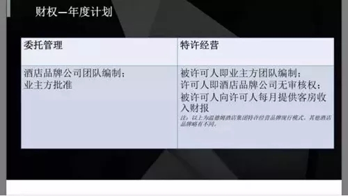 也比如說品牌公司認(rèn)為你的年度計(jì)劃編撰的不夠成功,必須要改這種情況在特許經(jīng)營的合作模式向下是不可能發(fā)生的,那么酒店日常經(jīng)營的過程當(dāng)中每項(xiàng)財(cái)務(wù)的支出的報(bào)批已審批,自然而然,也就是歸結(jié)于業(yè)主方的團(tuán)隊(duì)自行來打理,所以也就是表明在特許經(jīng)營的酒店日常經(jīng)營的財(cái)權(quán)實(shí)際上是在業(yè)主方自行組建的團(tuán)隊(duì)那里,酒店品牌公司是不可以參與的。這個(gè)與委托管理的合作模式下品牌公司對(duì)于酒店的年度計(jì)劃以及酒店每一項(xiàng)成本支出都有一個(gè)控制和審批權(quán)比起來是有非常大的區(qū)別。