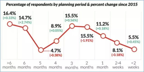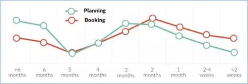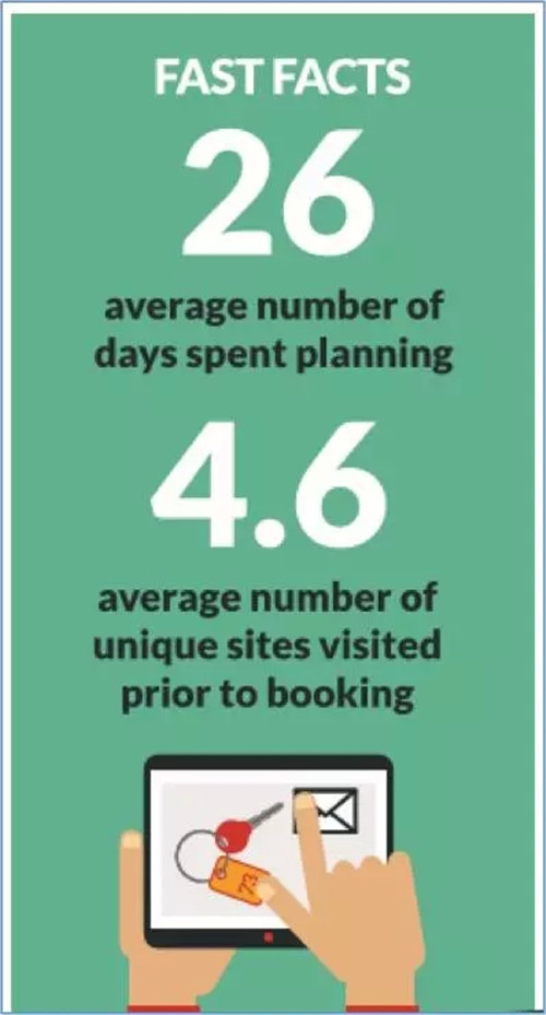 調查報告顯示,基本上有兩種類型的度假行程策劃者:即興的旅行規劃和充分的旅行規劃。即興的旅游規劃者往往在出行前的最早3個月內才開始思考和規劃自己的行程,這一類旅客占絕大多數,比例超過55%。相反,有31.1%的人是充分的旅行規劃師,他們會提前至少6個月開始規劃旅行。雖然消費者的一個總預訂趨勢是朝著“最后一分鐘才預訂”的方向發展,但還是有旅客會提前幾個月開始研究和預訂旅程。所以酒店應當保持與潛在客戶從開始規劃到整個購買周期的連續接觸。
