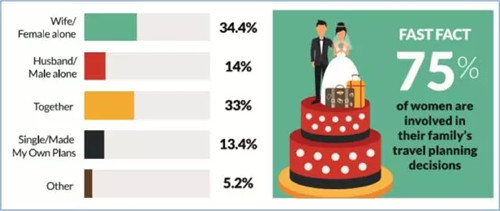 34%的受訪者表示,妻子或者說女性這一方會獨自計劃假期,這一比例與去年相比下降了4%,而丈夫或者男性獨自計劃假期的比例同比增加了3.5%。約有三分之一的夫婦表示,他們會共同討論和計劃他們的假期。這就意味著,女性參與休閑度假決策的比例高達75%以上。另一方面,調查結果也說明了我們不能只考慮女性,而忽略男性在旅游規劃過程中的作用,因為還有54%的男性參與了旅程的規劃,包括獨自和同自己的配偶一起完成。