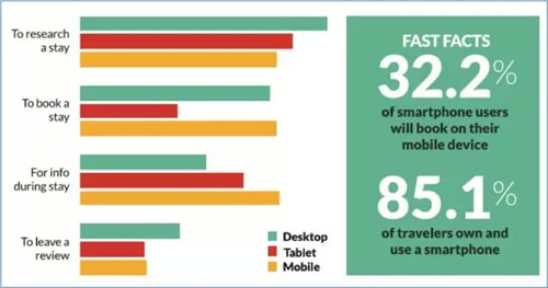 酒店要做成功的營銷,就需要盡可能多地了解消費者在搜索、規劃和預訂方面的用戶習慣。消費者在整個旅游規劃中所瀏覽的網站數量正在變少,那么他們又有哪些不同的工具和信息來源呢?調查中,Fueltravel要求參與者填寫有關使用何種設備來進行搜索、規劃和預訂的問卷。報告顯示,臺式機和筆記本電腦仍然是消費者最主要的搜索和預訂設備,但仍有越來越多的消費者開始頻繁地使用移動端設備來完成旅游產品的搜索和預訂,這也是未來用戶端的發展趨勢。