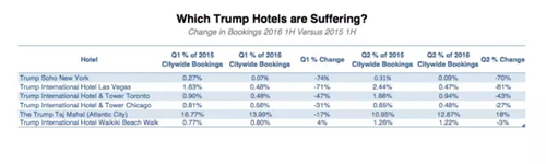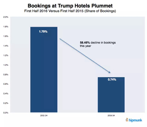 據(jù)美國旅游搜索網(wǎng)站Hipmunk統(tǒng)計,2016年上半年全美的特朗普酒店預(yù)訂數(shù)量的市場份額同比減少58%,可以說是暴跌。該網(wǎng)站的用戶多為城市地區(qū)的年輕人,似乎在特意避開特朗普品牌。