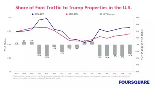 而來自Foursquare的數(shù)據(jù)同樣表明,從2015年6月川普宣布競選開始,Trump酒店的人流量下降了17%。
