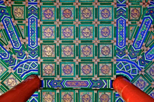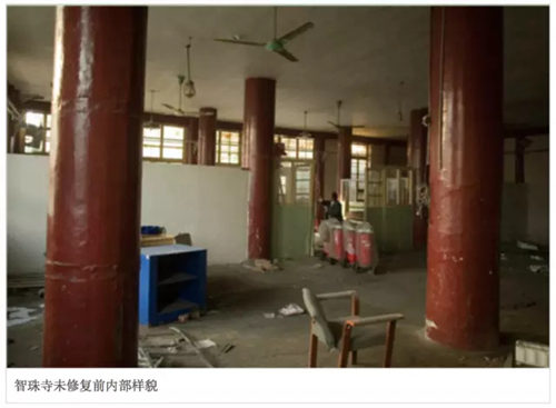 由于智珠寺屬于文物保護建筑,每一個環節修復之前都要得到北京市文物局批準,修完以后要得到文物局認可才能繼續下一個修復環節。腳下看似古舊的磚石下面,其實安裝了地暖。每一塊磚瓦、每一根柱子都是小心翼翼地拆下來,全部一一編號,幾千個編完號的磚瓦和木頭堆放在庫房中。據介紹,整個工程共清出了 200 卡車瓦礫,調換了 71 根木柱,整修了 1400 平方米棚頂。整修工作共修復了 43000 塊棚頂瓦片,對一個小小的寺廟而言,工程足可謂浩大。