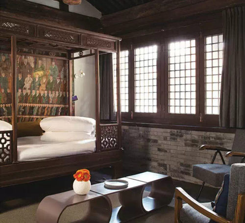 曾經智珠寺的大殿,如今改造成禮堂(Main Hall),作為舉辦活動的場地;大殿北面的后殿改造成休息室,供客人小憩;曾經的東面廡房,改造成會議室和畫廊;八間客房都位于院子后半部分,由于古今的元素在酒店中融匯共生,客房也被分化成了兩種不同的風格,其中的冥思、星辰、齊云、峨眉四間客房,坐落于曾經電視機廠的工人宿舍,內部的陳設獨具現代感。