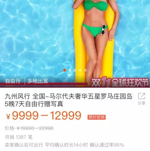 11月12日,阿里巴巴旗下旅行平臺飛豬公布了2016年雙11的成績單:全天交易總額達(dá)21.7億元,交易對應(yīng)未來680萬人次的出行;平臺上超過50個商家的單日成交額超過了千萬元。