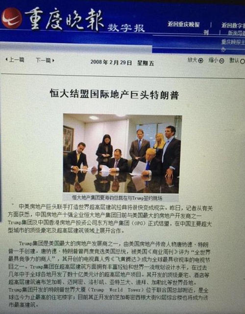 在特朗普勝出總統(tǒng)大選之后,8年前的一則新聞簡訊在特朗普勝選美國總統(tǒng)之后,再度刷爆朋友圈。這則簡訊的主要內(nèi)容是:2008年2月,中國房地產(chǎn)十強企業(yè)恒大地產(chǎn)集團與美國最大的地產(chǎn)開發(fā)商之一特朗普集團及中國香港房地產(chǎn)投資公司東方地產(chǎn)集團(OPG)正式結盟,在中國主要超大型城市的頂級豪宅及超高建筑領域展開合作。