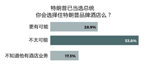 相較5月份,總統(tǒng)競(jìng)選后6%的人表示他們有可能會(huì)住特朗普品牌酒店,但這6%的人并不知道特朗普真的擁有酒店,這和不會(huì)住特朗普品牌酒店其實(shí)差不多。