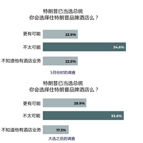 調(diào)查數(shù)據(jù)和此前獲得的數(shù)據(jù)十分相近,區(qū)別是相比以前有更多的人愿意住特朗普品牌酒店,但他們不知道候選人真的擁有酒店。