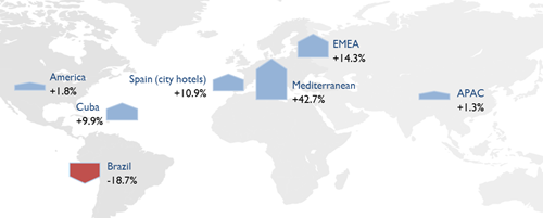 在西班牙中部,馬德里的每間客房可用收益相較去年獲得了兩位數(shù)的增長,表現(xiàn)出色的有Tryp Gran Vía, Meliá Galgos以及位于機(jī)場附近的酒店。位于西班牙東部的酒店獲得了將近1,300萬的收益增長,其中40%來自于第三季度,許多適合商務(wù)出行及休閑旅游的地區(qū)得益于假日的積極影響,如阿利坎特,巴塞羅那,塔拉戈納的帕爾馬馬略卡島,以及美利亞官方網(wǎng)站在線預(yù)訂平臺的銷售實(shí)力都是重要原因。