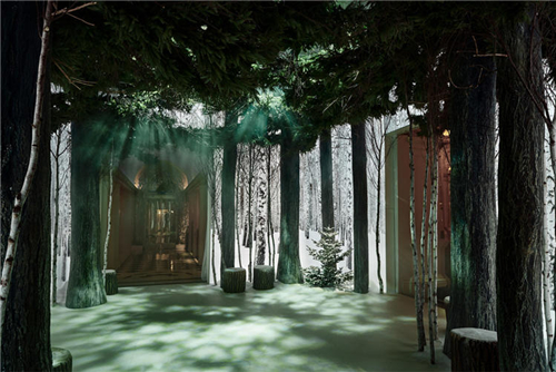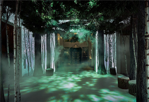 或許和他們的工業設計背景相關,Jony Ive 和 Marc Newson 的設計著重探討了自然與技術,傳統與未來,以及二維和三維空間的關系。他們在整個酒店的入口處安裝了四米高的燈箱,上面顯示的是被冰雪覆蓋的銀白色樹木的樣子,結合純白色的地板,還有周邊以及天花板上的蘇格蘭松樹的模型,強化了這種猶如置身森林之中的真實感。
