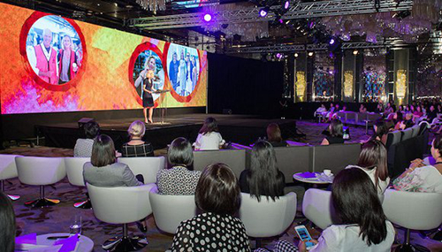 在麗思卡爾頓酒店的鉆石廳里,座位呈扇形擺放,一塊比演講臺還寬的顯示屏是主要光源之一。這塊屏幕很大,大到會讓投射上去的明艷色彩顯得更加張揚,讓鼓舞人心的短句顯得更讓人信服。Beyoncé的歌聲有力地循環著,“Who run the world?Girls.” (誰掌管這個世界?女生們。)這一切讓人情緒高漲。