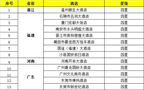 被摘13家四星級酒店,主要分布于廣東、浙江、福建和河南4省市。其中,光福建被摘四星級酒店就達到7家,廣東達到4家。除最佳西方外,其余12家酒店皆為單體酒店,且開業時間都比較長,是升級改造的重點項目。未來,這些酒店或在競爭中向中檔酒店品牌靠攏,以更親民的價格和更細致的服務打動消費者!