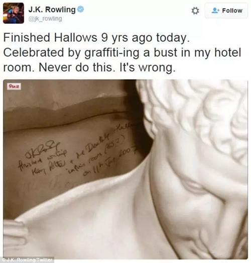 羅琳紀念創作完結的方式也很獨特,她在房間里的赫爾墨斯(希臘神話中的人物)雕像的背后偷偷寫下了“在2007年1月11號,J.K. 羅琳在552房間完成了《哈利波特與死亡圣器》”。這個原本面對房間的雕塑現在也被反方向放置,就是了能夠讓大家都看到這句話。