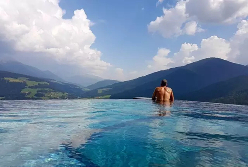 近日,一間專門提供給滑雪者與健行者的酒店Hotel Hubertus進行改造,在其頂層建了一個非常考驗勇氣的泳池。