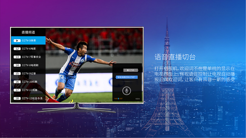 打開電視機,歡迎詞不在是單純的顯示在電視界面上,輝視語音控制讓電視自動播報迎賓歡迎詞,讓客戶有耳目一新的感受。